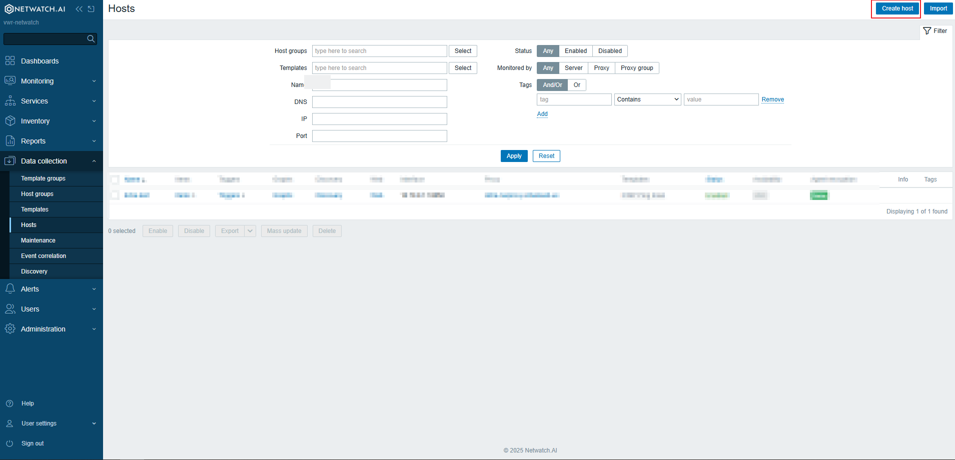 Once the host is added, it will be visible in the Hosts list, and monitoring will begin based on the linked templates.