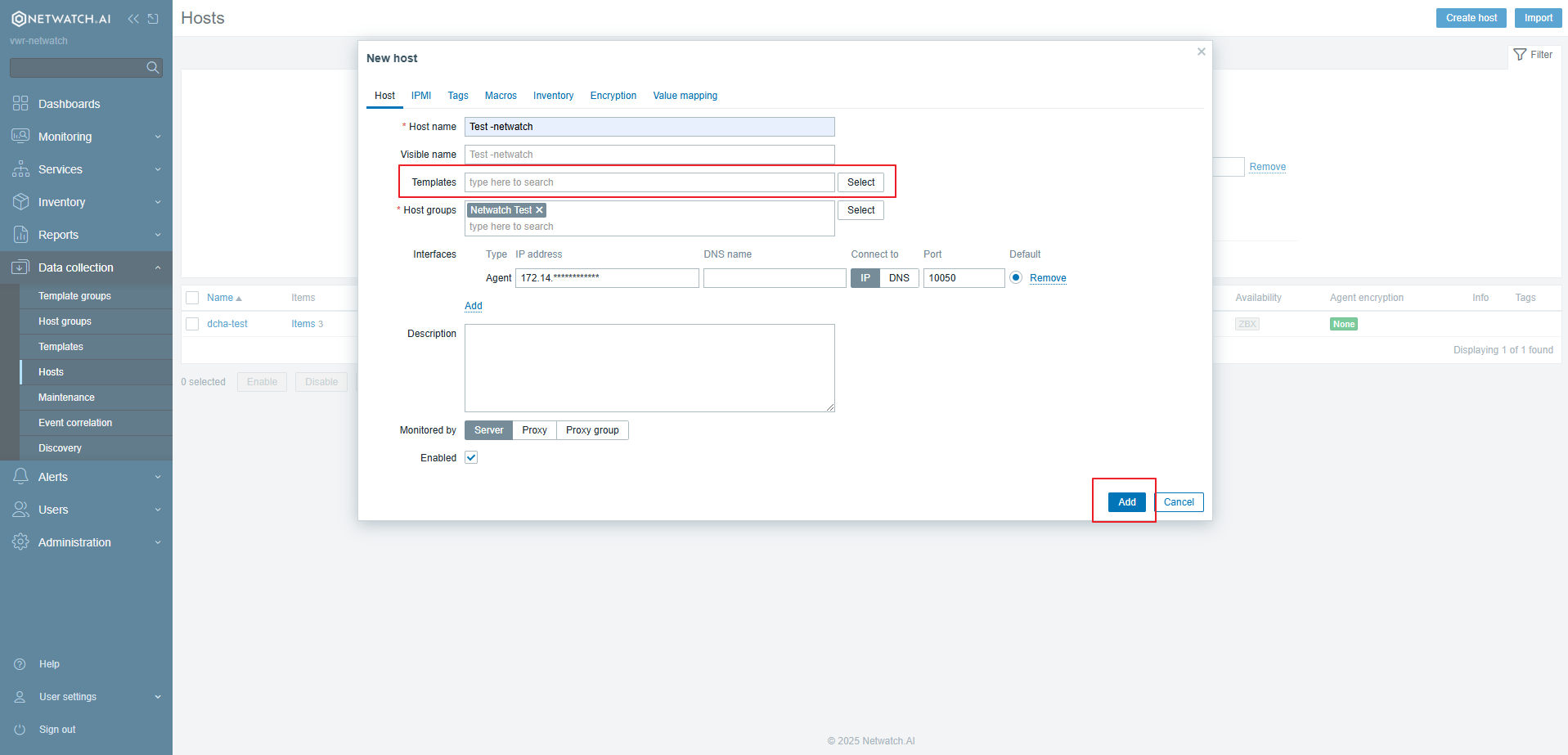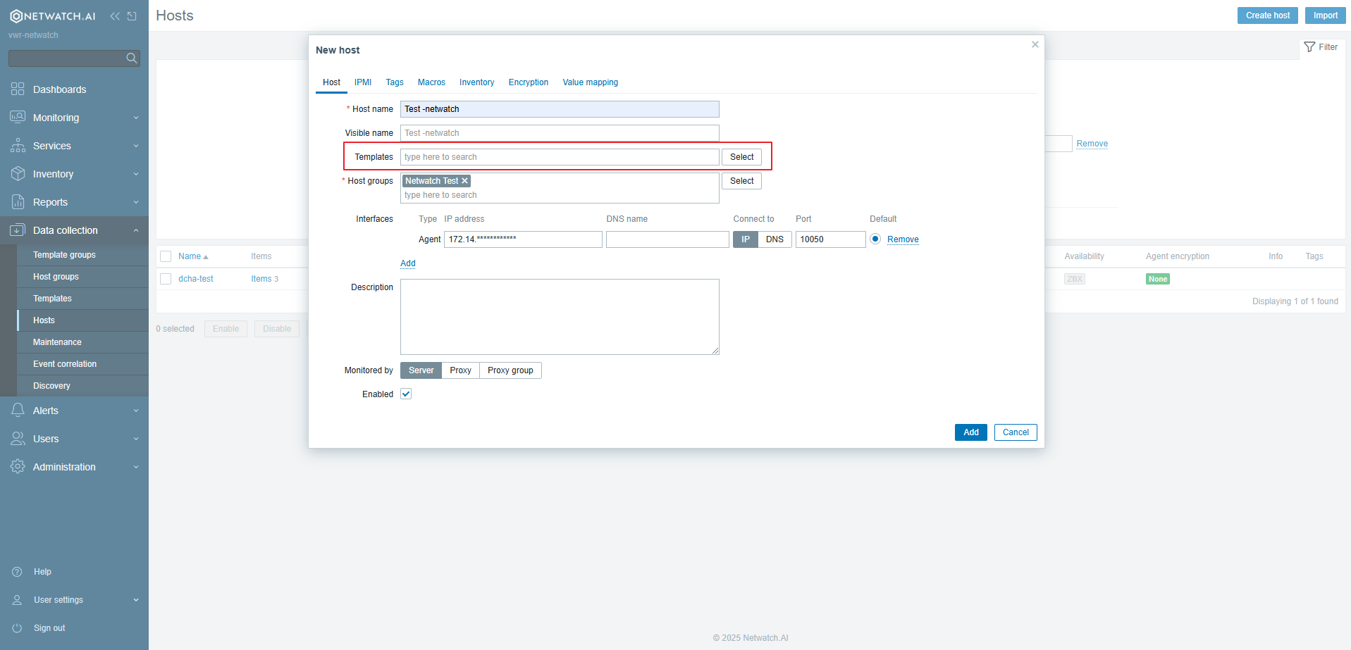 - In the Templates tab, link appropriate templates to define monitoring parameters.